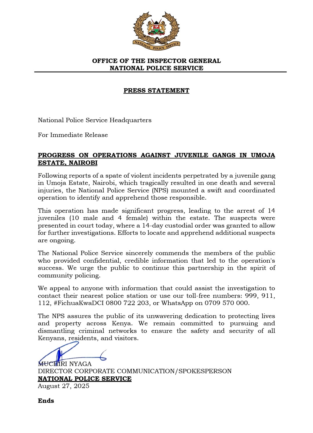 PRESS STATEMENT : PROGRESS ON OPERATIONS AGAINST JUVENILE GANGS IN UMOJA ESTATE, NAIROBI